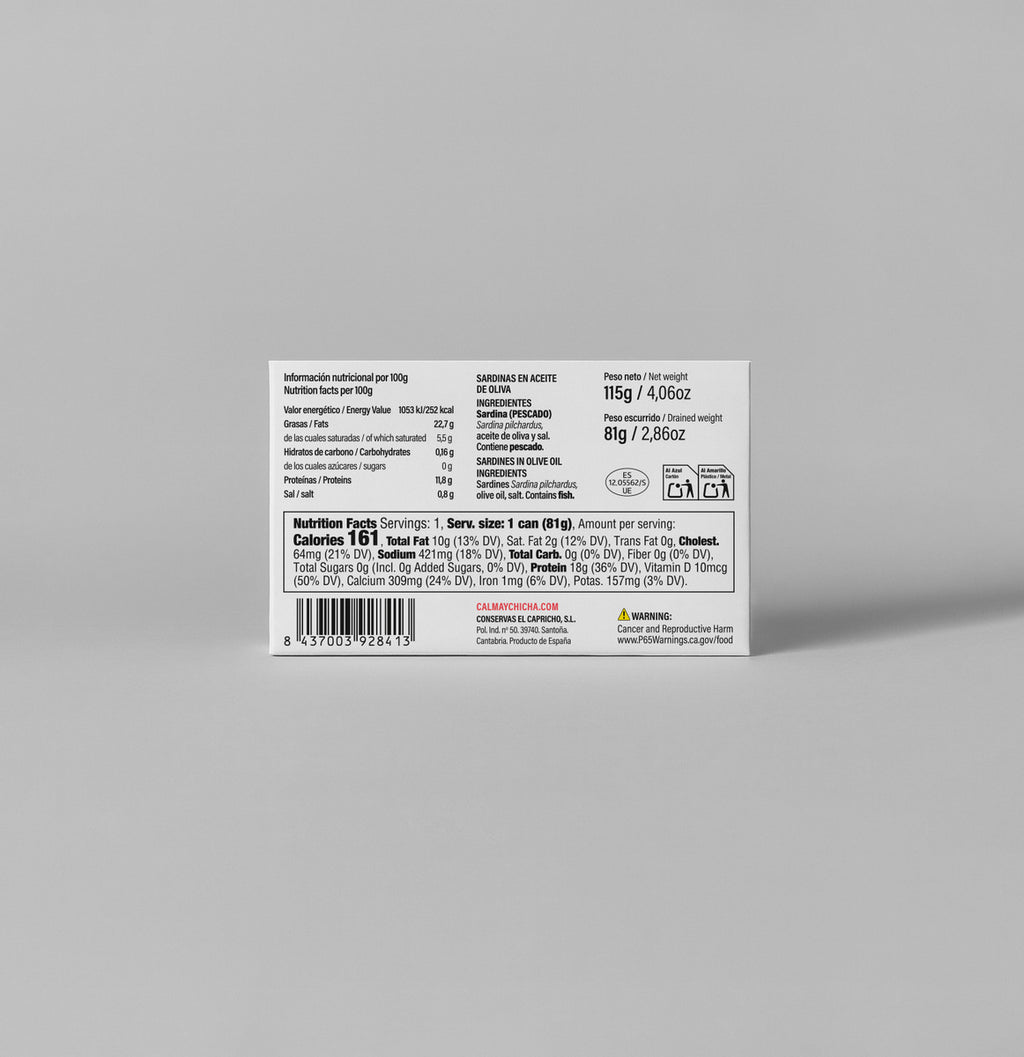 Calma & Chicha sardines in olive oil are a tribute to the Cantabrian Sea and its long-standing fishing tradition. Made with small, carefully selected sardines from the Cantabrian waters, they are preserved in high-quality olive oil that enhances their natural flavor, texture, and freshness.