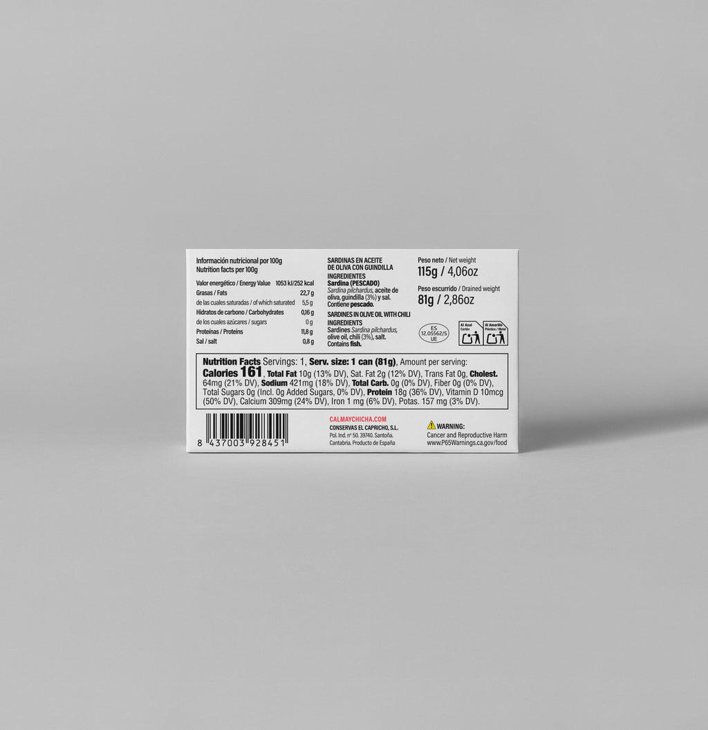 Calma & Chicha sardines in spicy olive oil bring a bolder expression of the Cantabrian Sea, blending tradition with a subtle spark of heat. Prepared with carefully selected small sardines from Cantabrian waters, they are preserved in premium olive oil infused with just the right touch of spice to enhance, not overpower, their natural flavor.